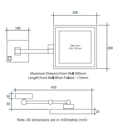 - This mirror can be folded back out of the way against the wall or pulled forward with good vertical adjustment to make it easy to use.