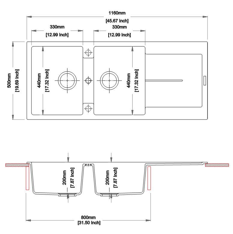 Introducing the Granite Double Bowl Kitchen Sink in stunning black. With its generous size of 1160x460x200mm, this sink is designed to elevate your cooking experience. Made from durable granite, it boasts double bowls for added convenience. Upgrade your kitchen with a touch of luxury.