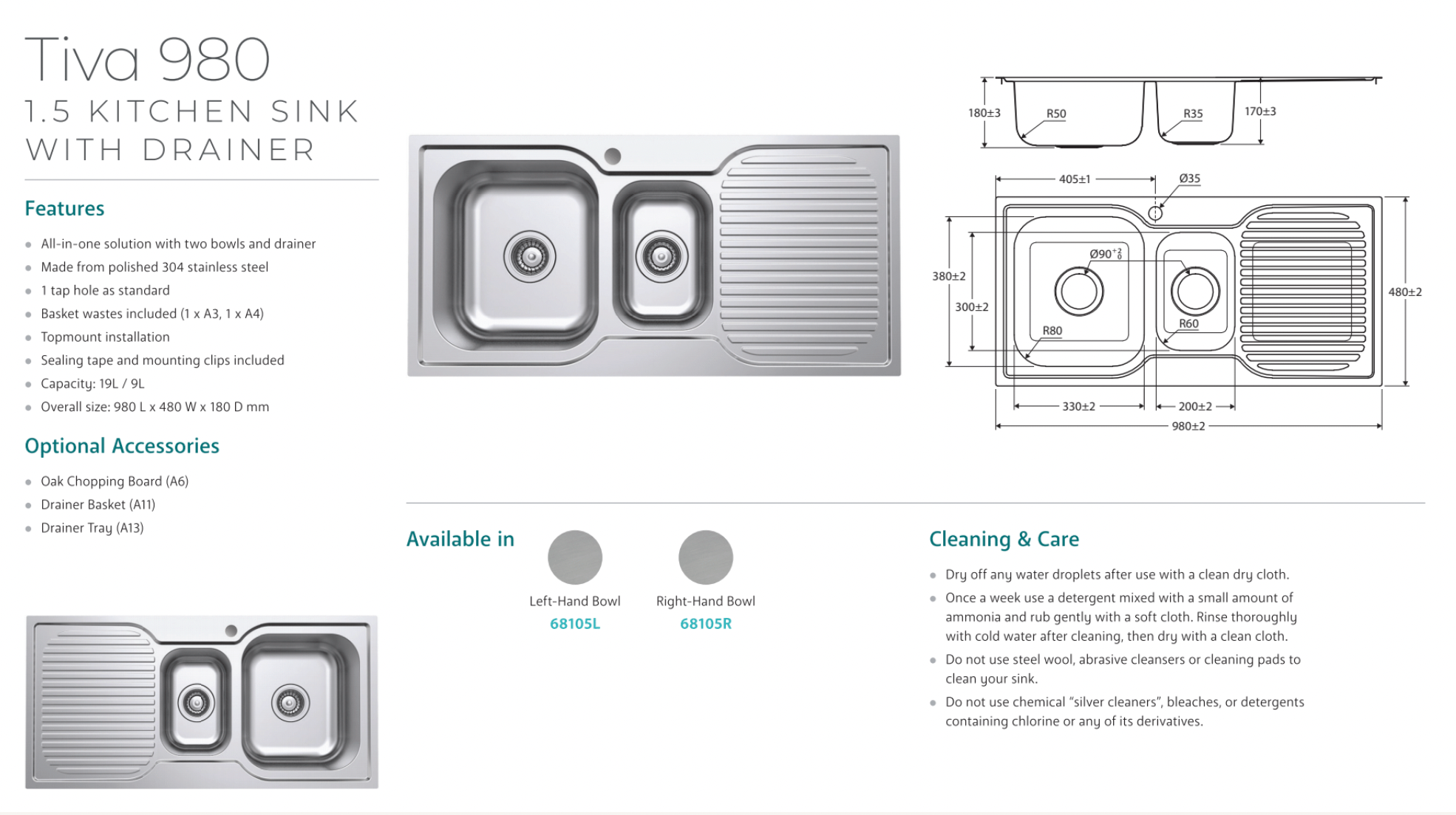 Fienza Tiva 980 1.5 Kitchen Sink with Drainer