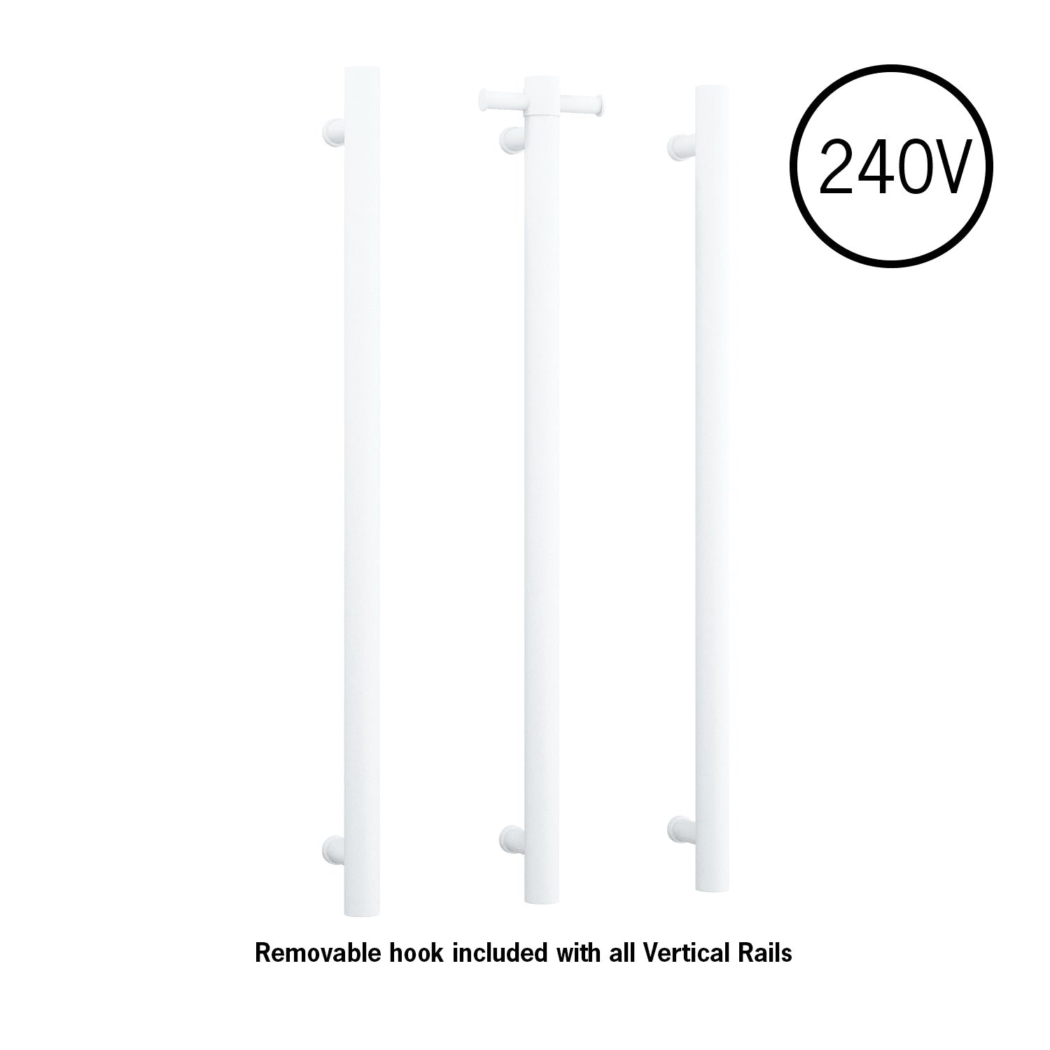 Introducing the Thermogroup Round Vertical Heated Rail. With no need for a transformer, installation is effortless and eliminates potential issues. Use a timer to control the rails and save on costs. Enjoy the comfort and luxury of this 240V rail, available in a sophisticated matte white finish.