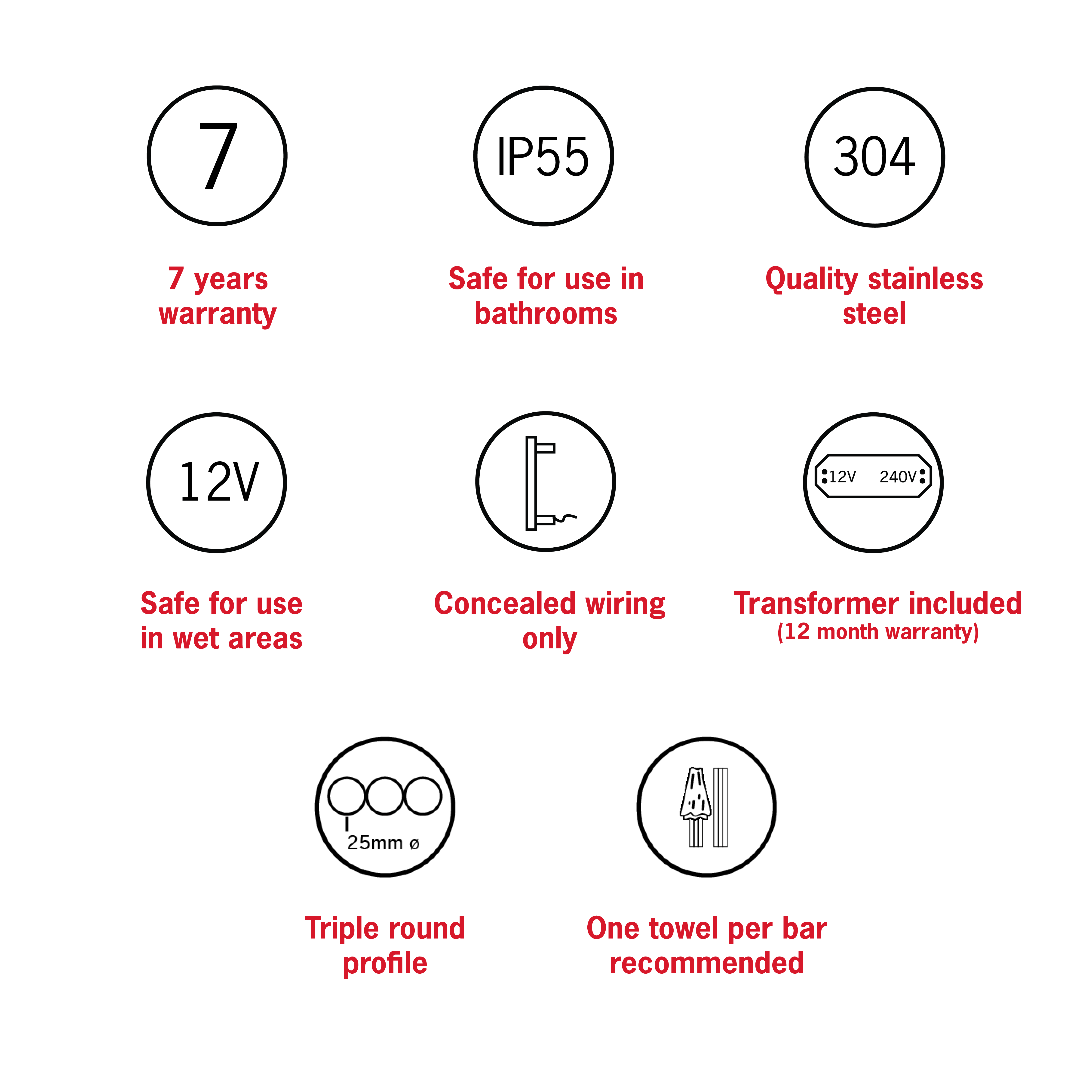 The Thermogroup Triple Tube Vertical Single Heated Towel Rail in Brushed Nickel not only adds a touch of luxury to your bathroom, but also ensures safety with its 12 volt installation. The included transformer and recommended timer save on running costs while still providing warmth and drying capabilities for your towels.