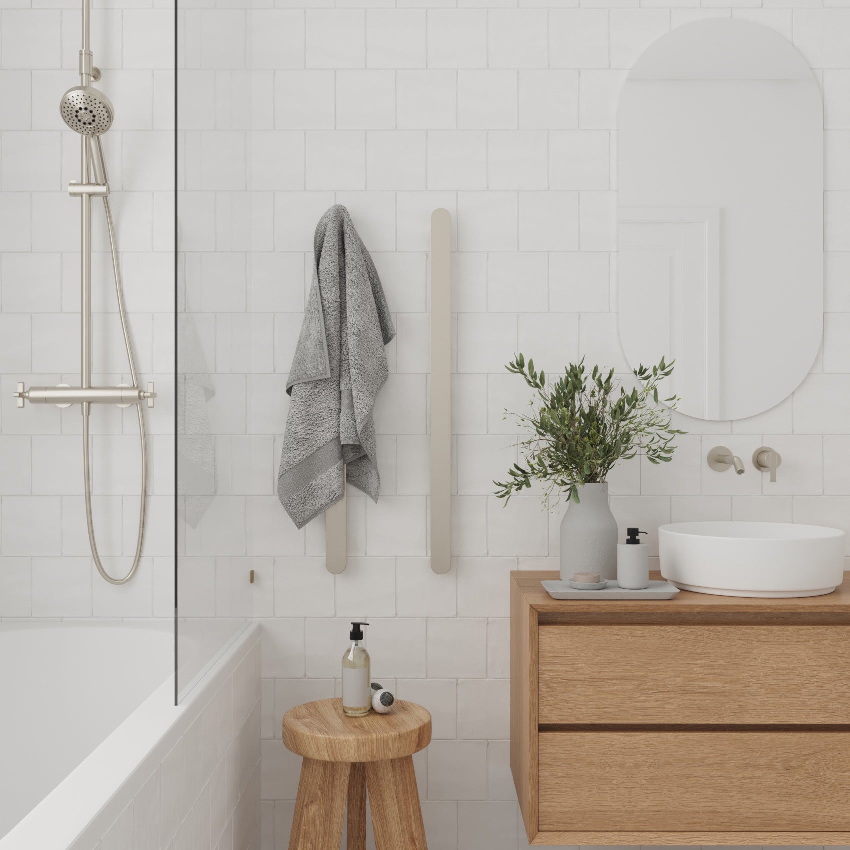 The Thermorail Pill Vertical Heated Towel Rails offer a luxurious addition to any bathroom, and the brushed stainless finish coordinates with Brushed nickel tapware. Its unique pill shape adds a delicate touch to the space and complements the overall design. Plus, the VP900 is ideal for bathrooms with limited wall space, providing a convenient way to dry towels.