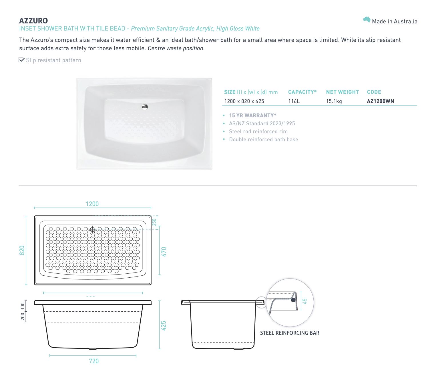 Decina Azzurro Inset Shower Bath 1200mm - Gloss White