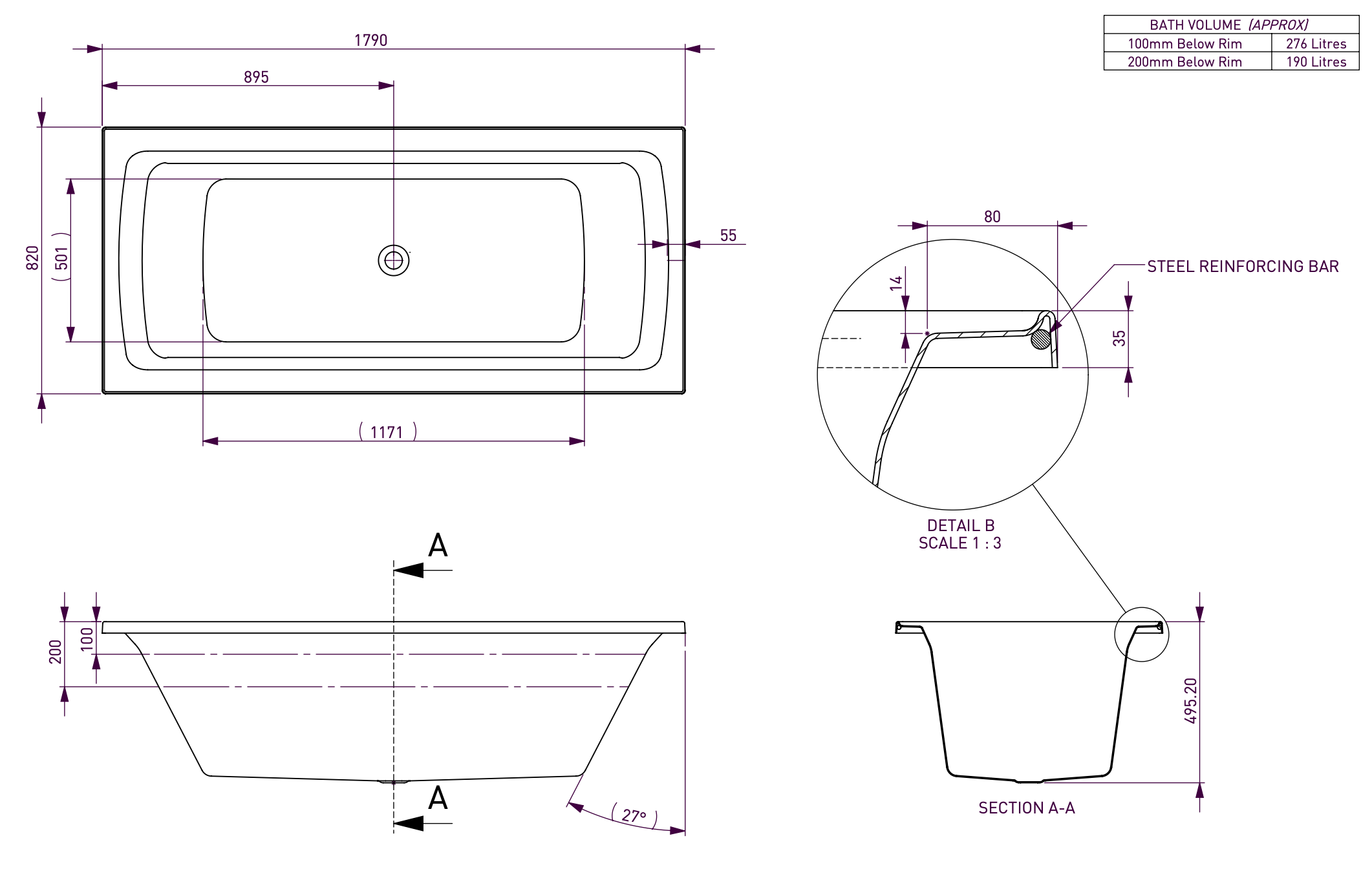 Decina San Diego Inset Bath 1790mm - Gloss White