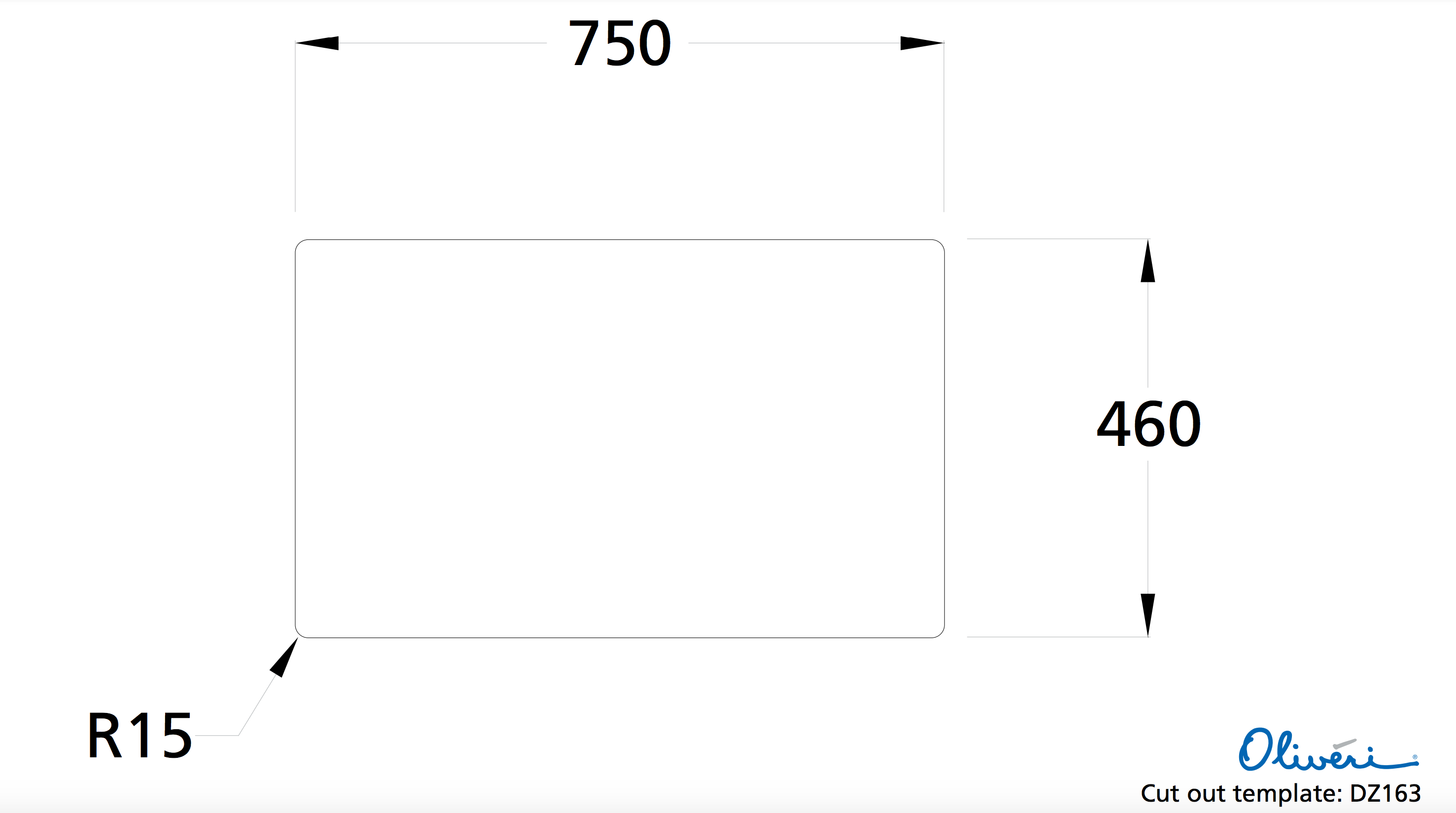 | Cut out template | 750mm x 460mm x 15mm radius |