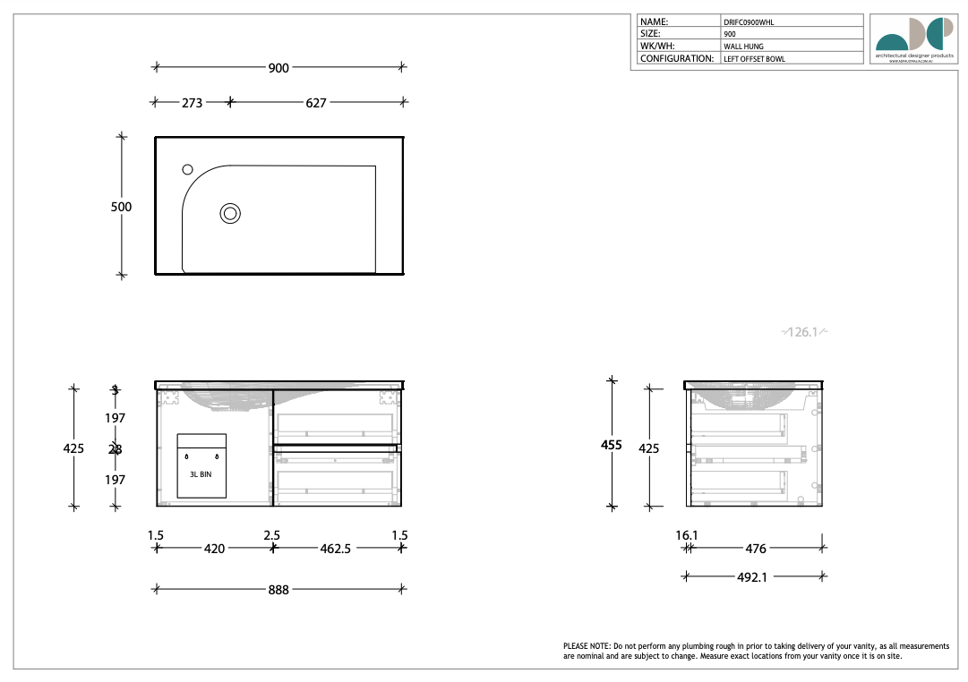 • Drift Wall Hung Vanity is available in 900mm and, 1200mm options
