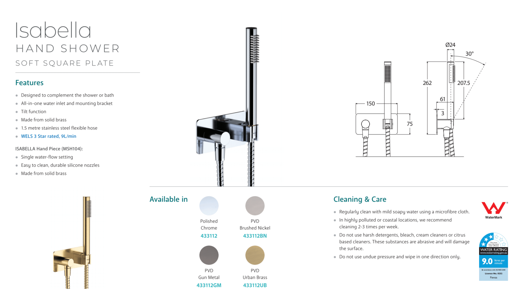 Elevate your bathroom experience with the Fienza Isabella Hand Shower in chrome. Its sleek design and refined finish add a touch of sophistication, while delivering a smooth, invigorating water flow. Crafted for both style and functionality, this hand shower offers effortless handling and enhances your daily routine with a modern, elegant touch.