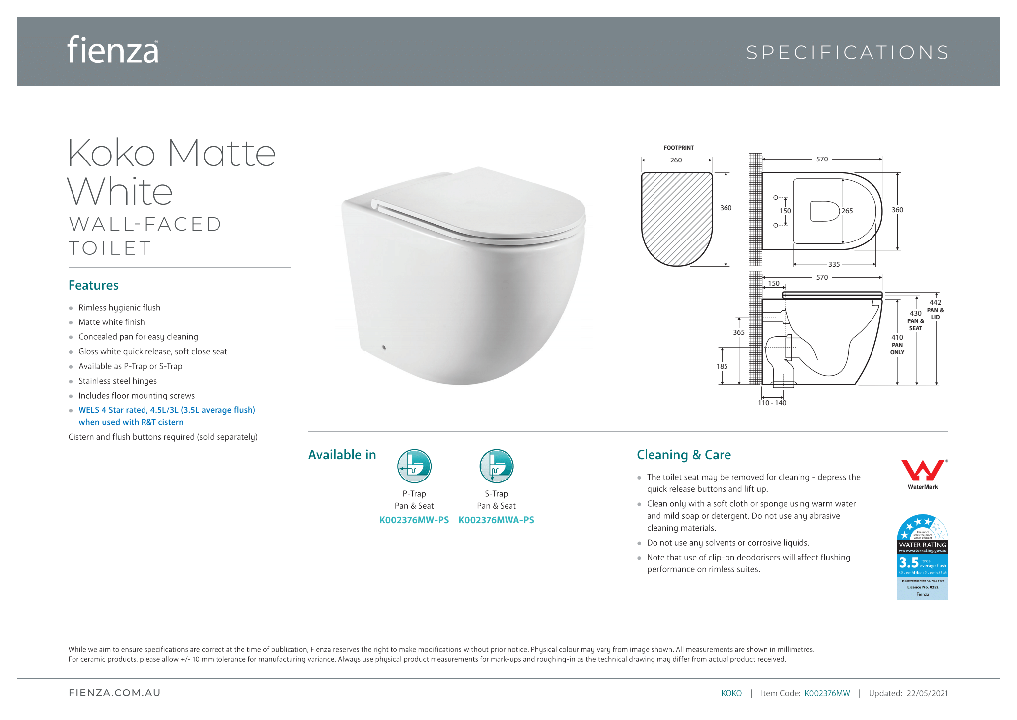 WELS 4 Star - 4.5L/3L (3.3L avg/flush) with R&T cistern