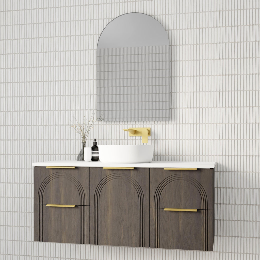 Image 1: Marquis Arco Wall Hung Vanity 1200mm Matte White Paco Above Counter Basin, Bottega Oak Cabinet Finish, symphony Blanco Benchtop, Brushed Brass Top Pull Handles, Arco Mirror