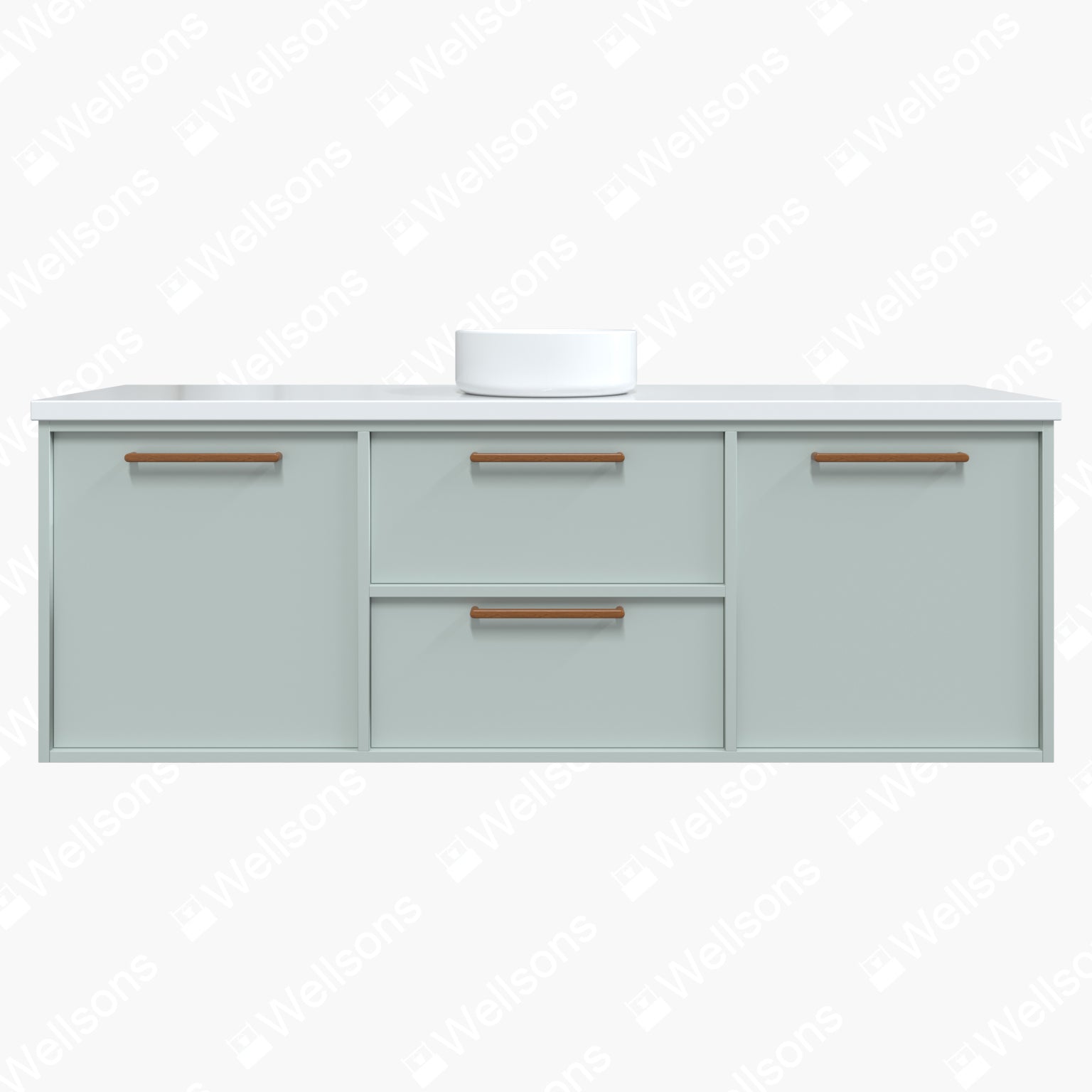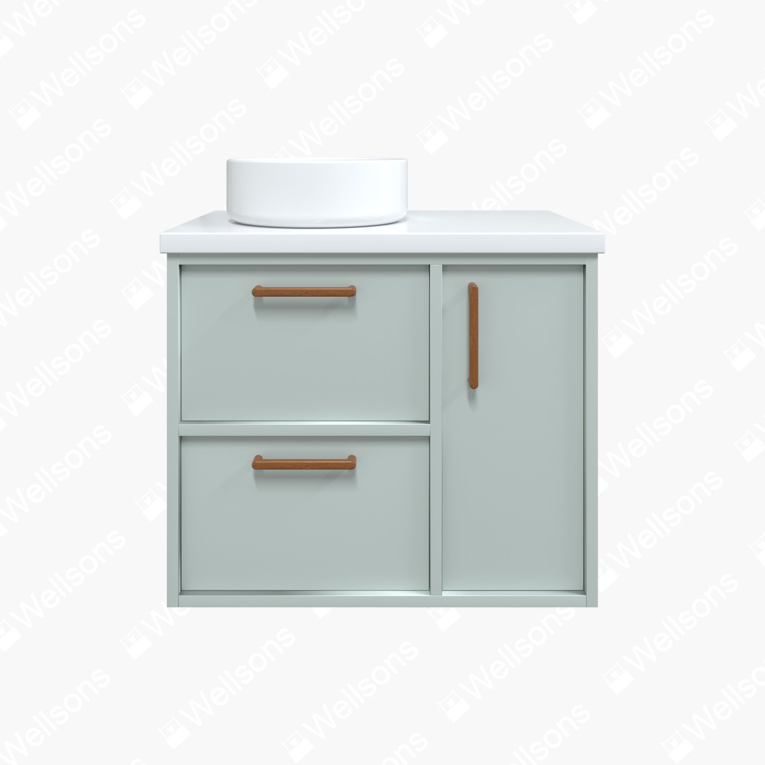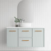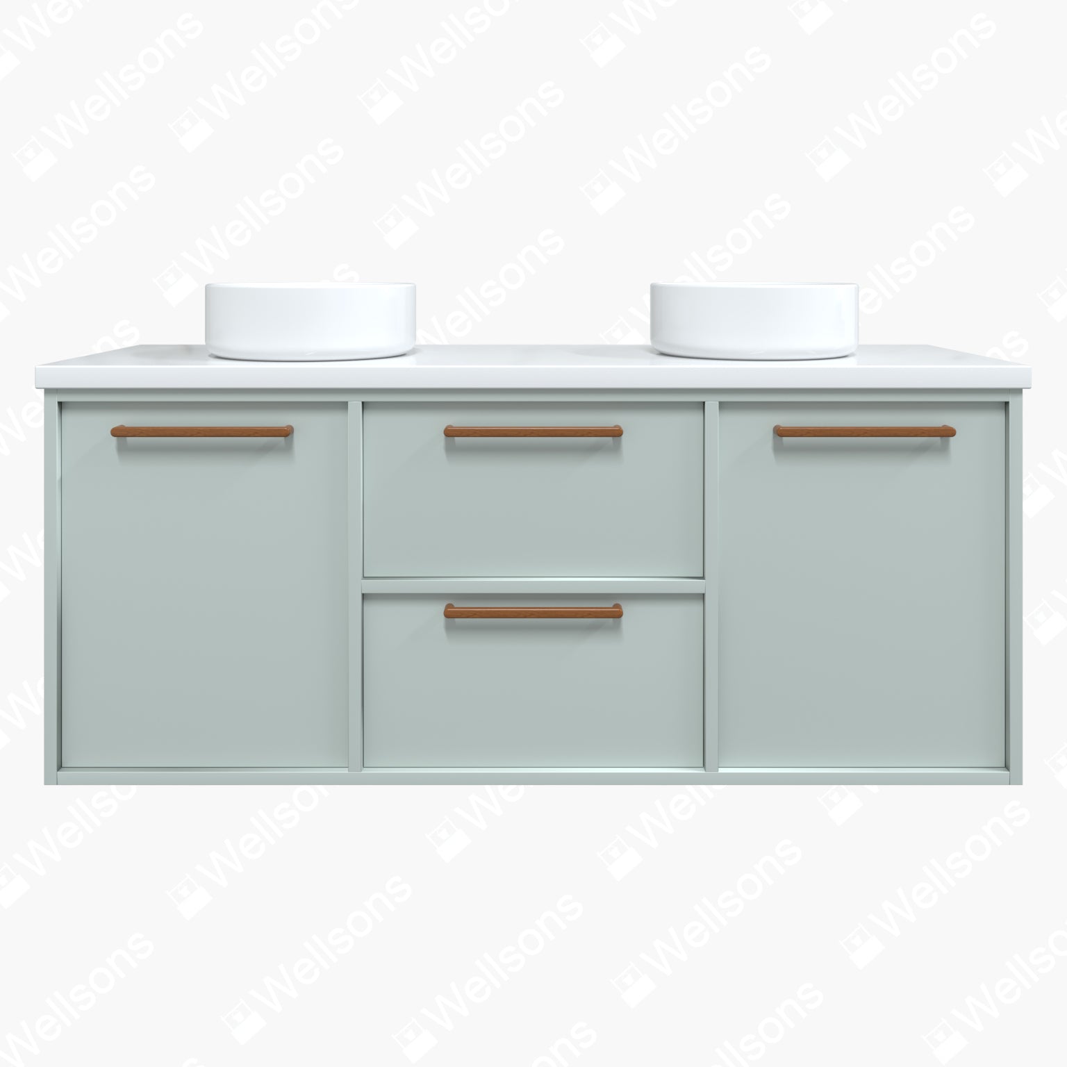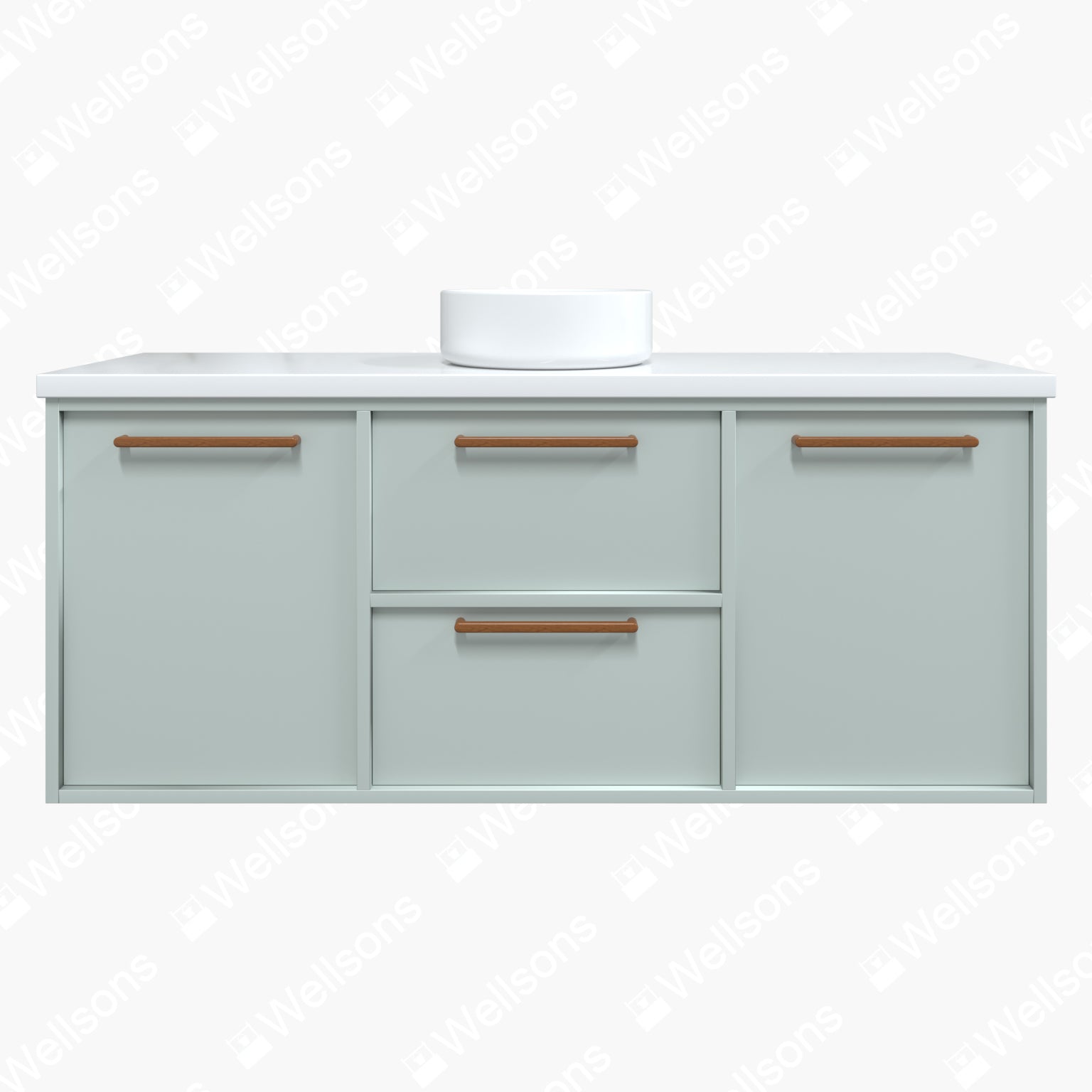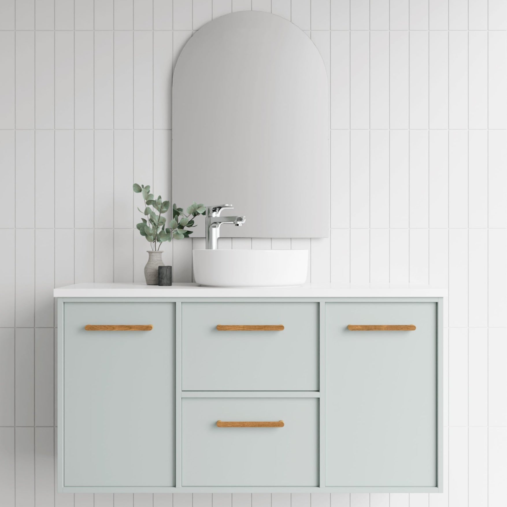 Image: Marquis Palm Wall Hung Vanity 1200mm Centre Bowl in Spinifex Cabinet Finish, Paco Above Counter Basin in Matte White, Pinta Wooden Handle, Symphony Blanco Benchtop