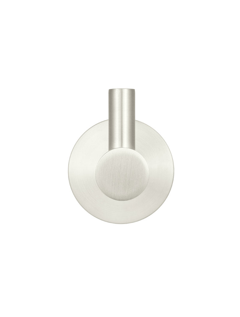 The Brushed Nickel finish of the Meir Round Robe Hook exhibits remarkable adaptability, appearing distinctively under natural, warm, or cool light settings.
