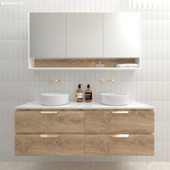 Timberline Nevada Plus Wall Hung Vanity with Prime Oak Cabinet with Carrara SilkSurface Top and Black Matt Allure Basins