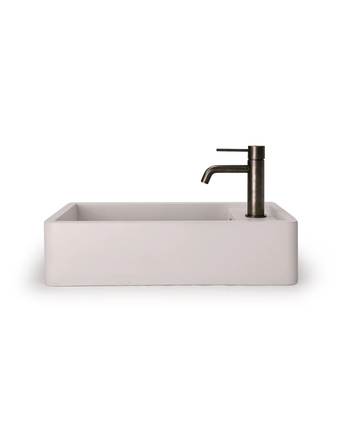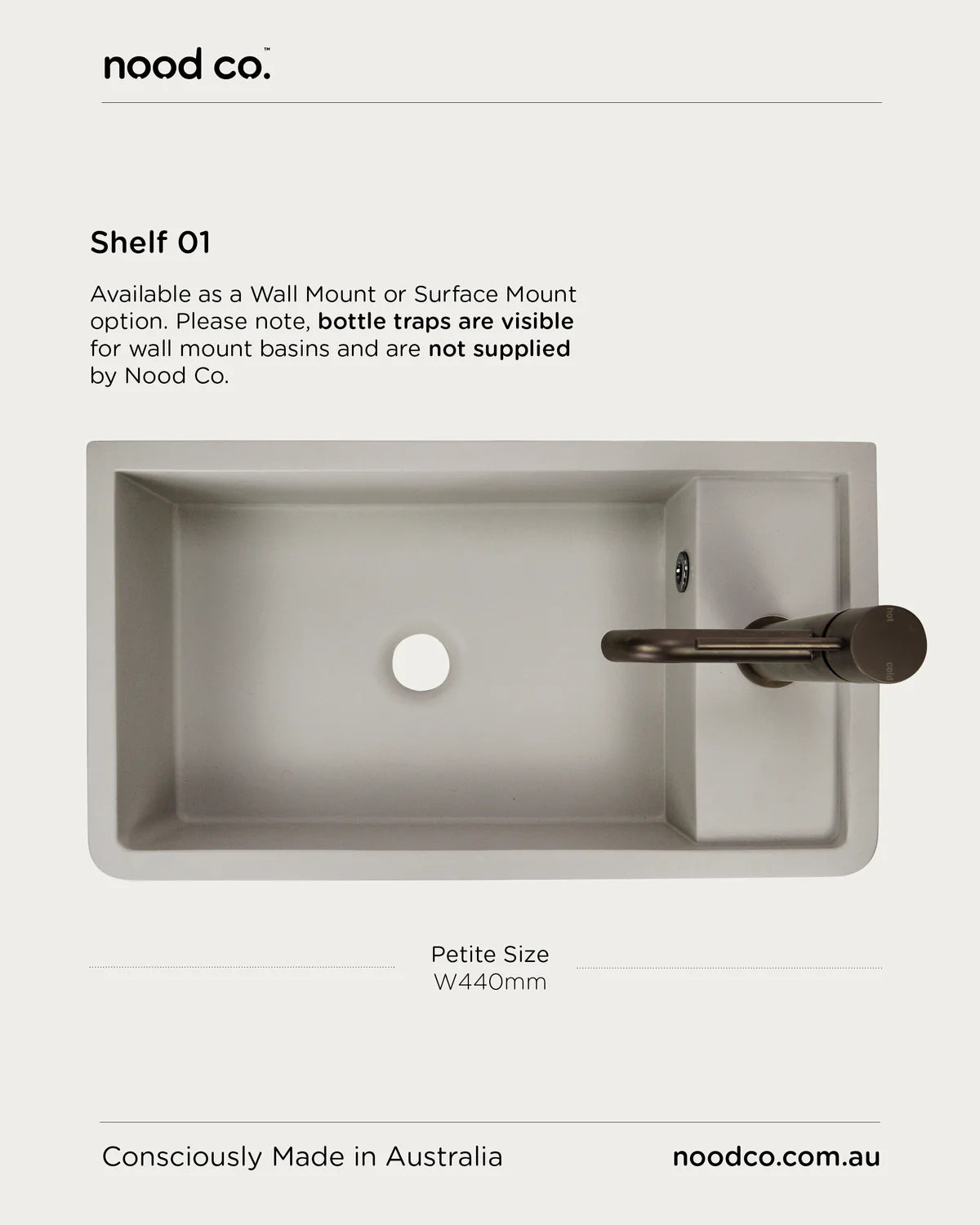 Nood Co Concrete basins are comprised of a natural material. Each piece has a visual patina, colour variation, pin-holing (surface holes) and surface variation. These characteristics have no bearing on the structural integrity of the concrete piece. Nood Co Concrete colours, feel, and aesthetic can look different in photos and it is suggested to purchase sample pieces prior to manufacture to ensure you are comfortable with your product.