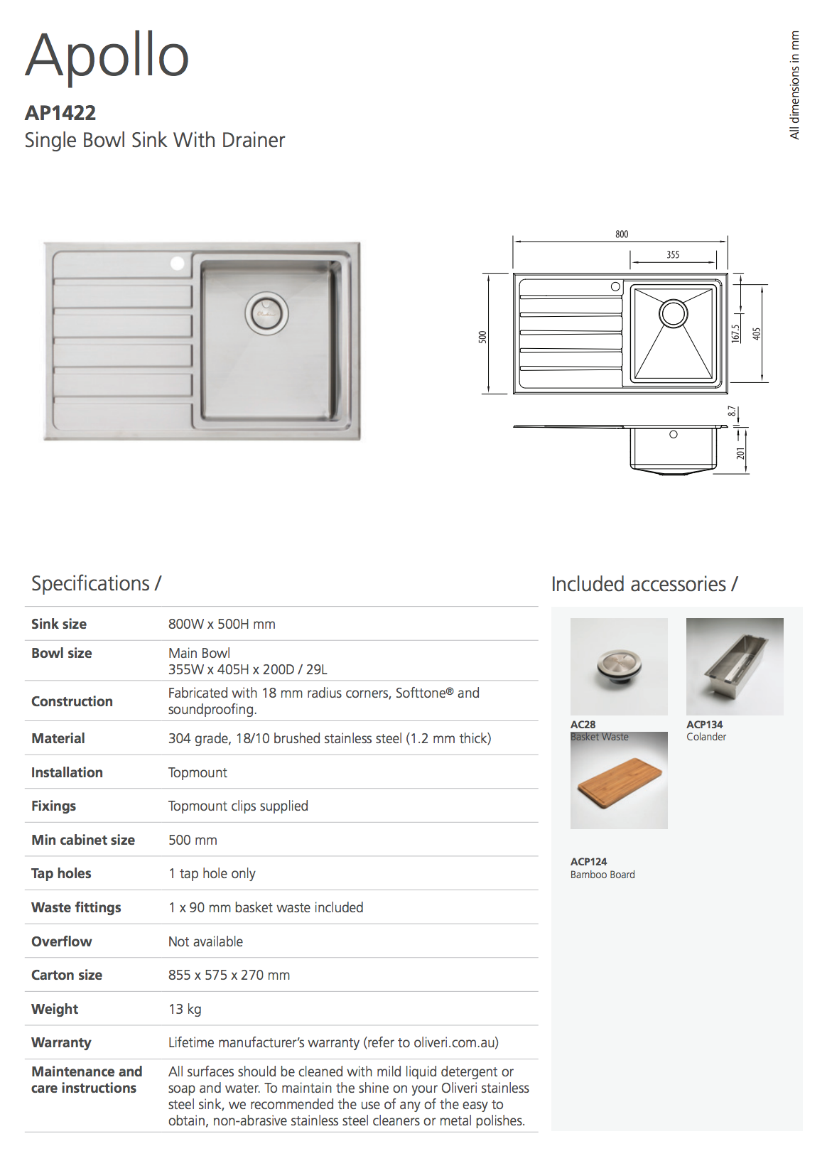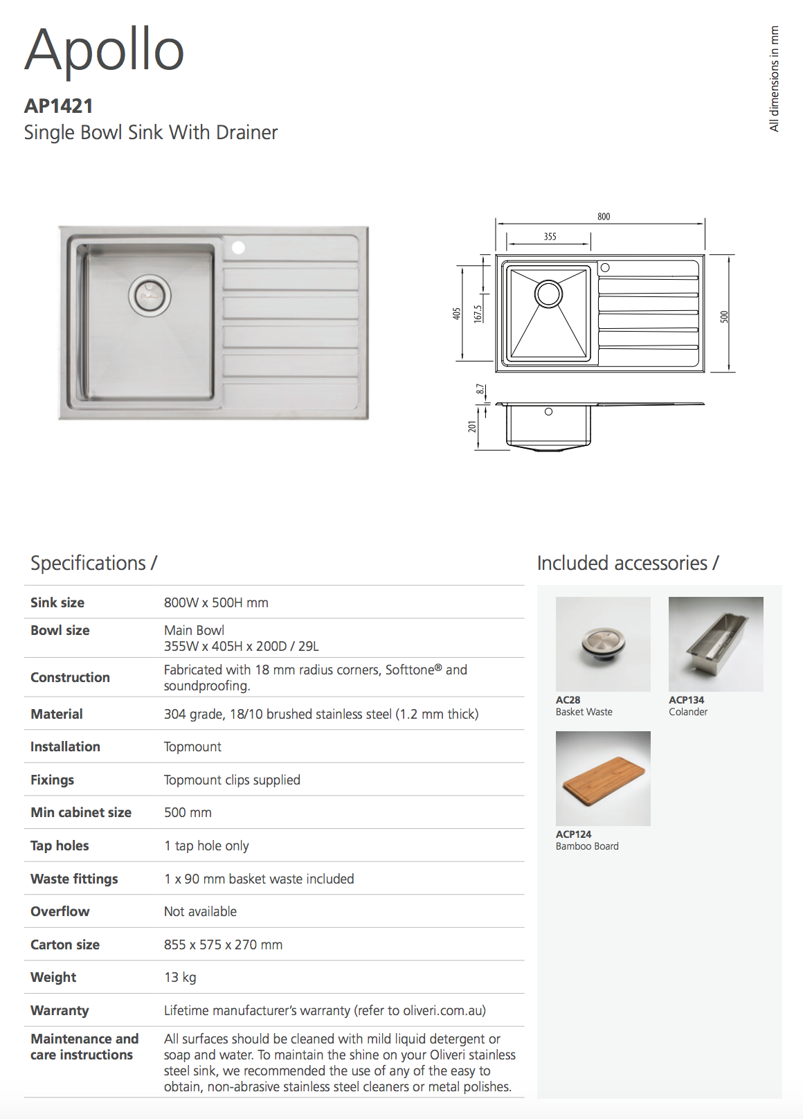 The Apollo Single Bowl Sink is a versatile sink which would be suited to as a kitchen, butler or laundry sink. This model is complete with integrated colander and bamboo preparation board which fit comfortably within the bowl.