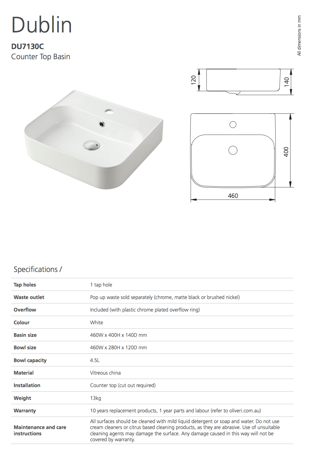 | Basin size | 460mm x 400mm x 140mm |