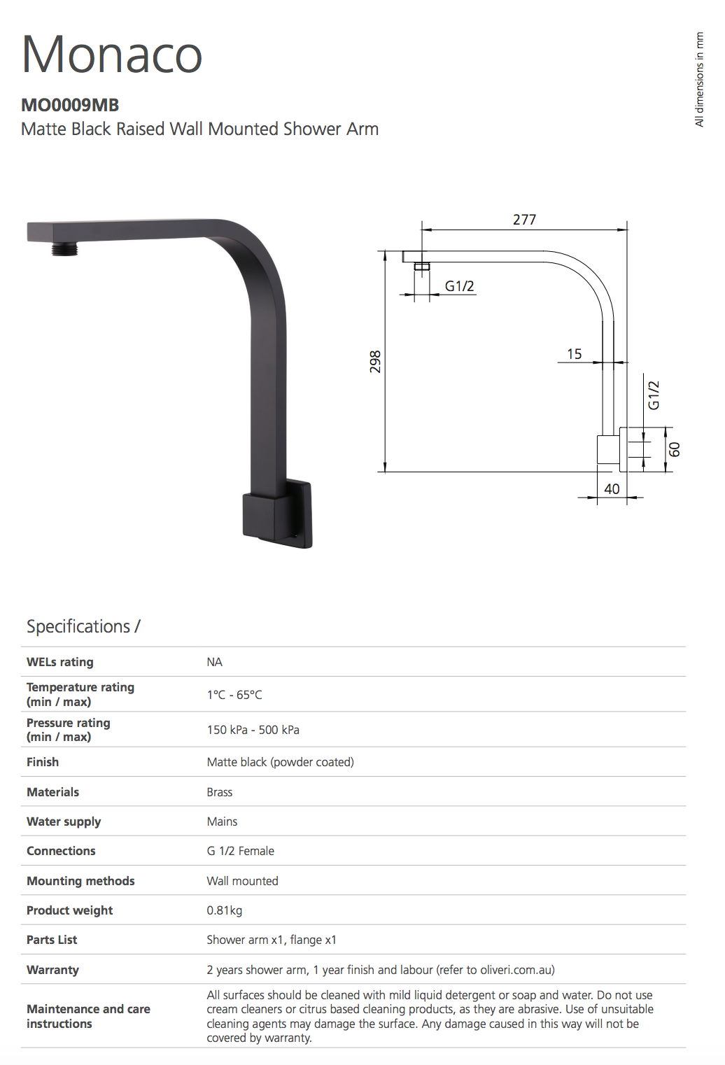 Warranty2 years shower arm, 1 year finish and labour (refer to Service & Warranty page)