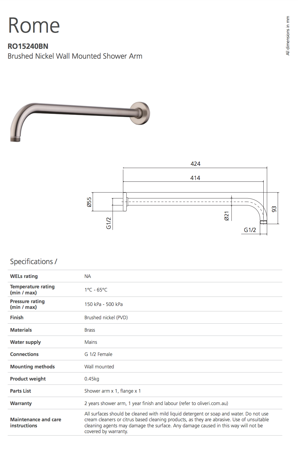 | Warranty | 2 years shower arm, 1 year finish and labour (refer to Service & Warranty page) |