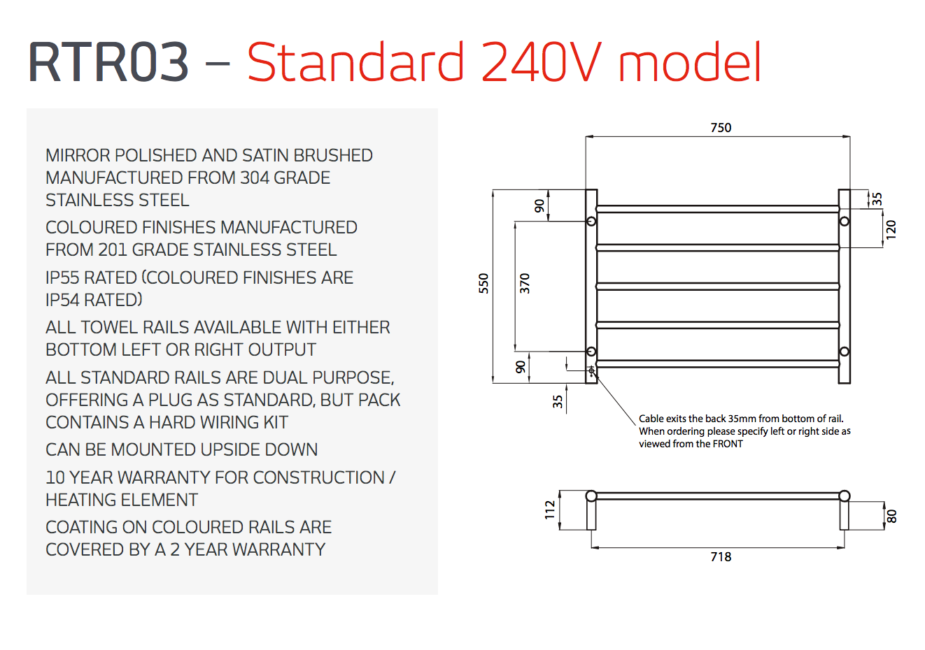 Elevate your bathroom with the Radiant Heating Round Bars 240V Heated Towel Rail in polished finish. Designed to blend seamlessly with both traditional and modern interiors, this elegant towel rail offers practical warmth and ensures your towels stay dry and cozy. Measuring 750 x 550 mm, it provides an ideal balance of style and function. Included is a 105W transformer for low-voltage installation, recommended only when necessary, such as near showers with pre-installed low-voltage wiring. Experience refined comfort and timeless design in one luxurious accessory.