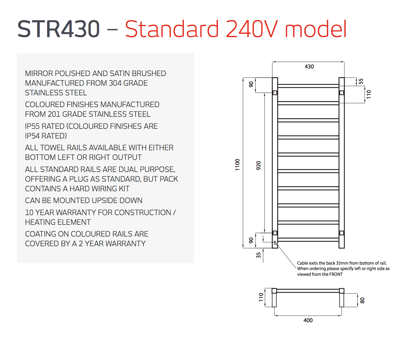 Radiant Heating Square Bars 240V Heated Towel Rails Polished 430 x 1100