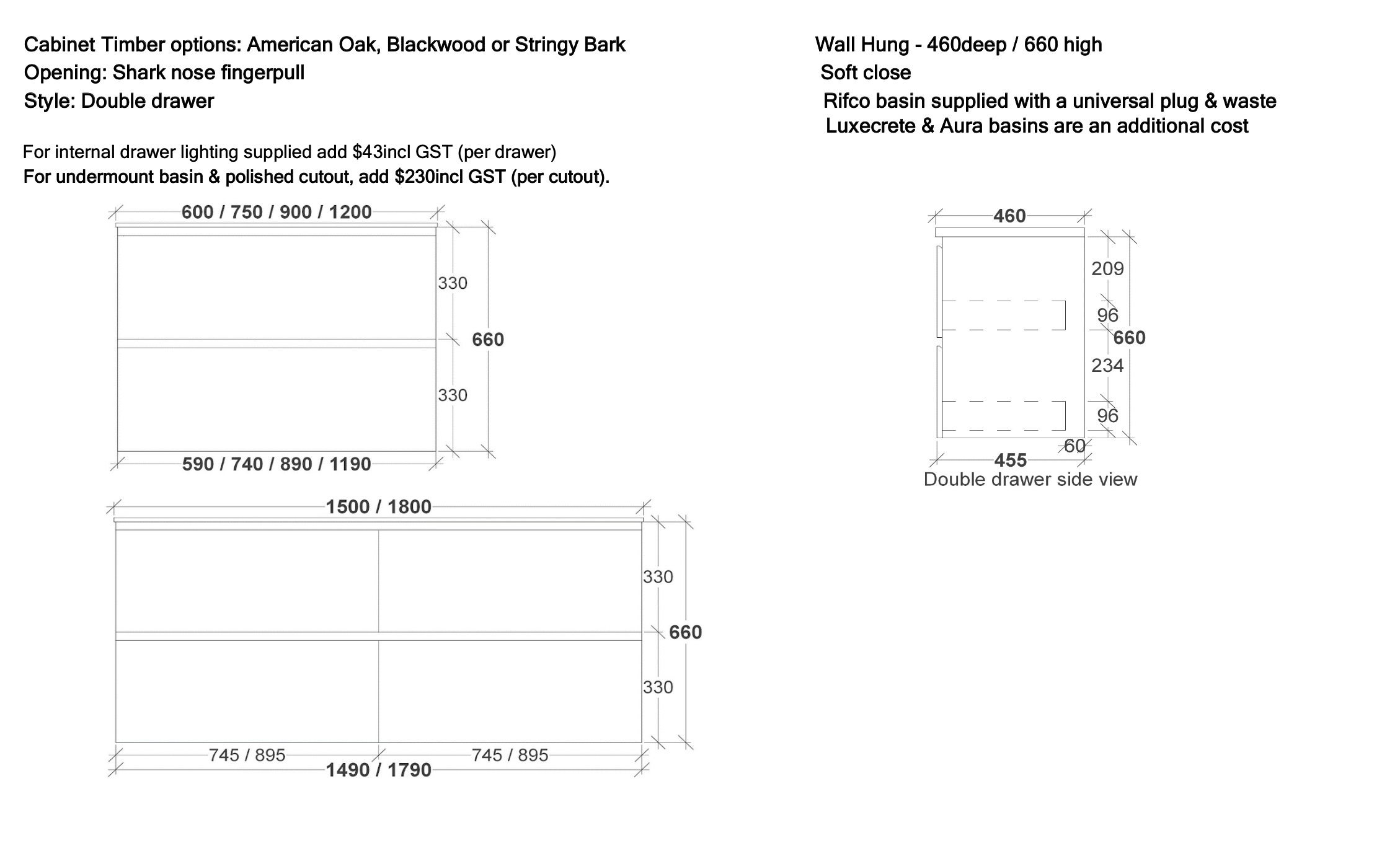 Rifco Products are all made to order in Australia. Allow a 6 - 8 week lead-time from time of confirmation for vanities and up to 4 weeks lead time for cabinets.