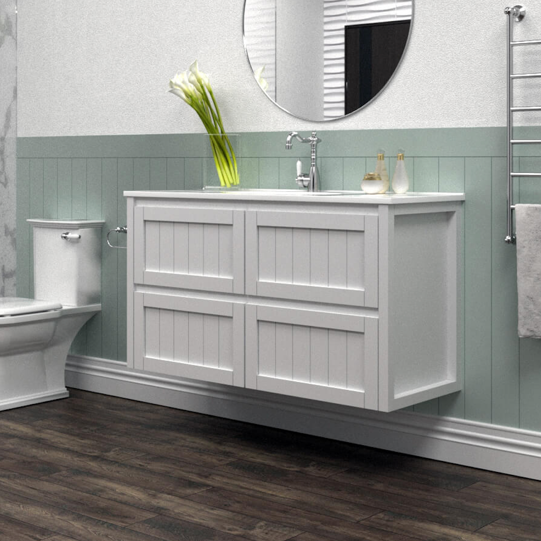 Hampton cabinets feature popular modern-vintage styling with beautifully routered drawer fronts and a smooth satin finish. Wall mounted at your preferred height.