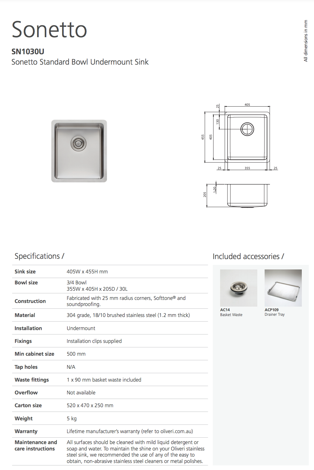 Warranty Lifetime manufacturer’s warranty (refer to oliveri.com.au)