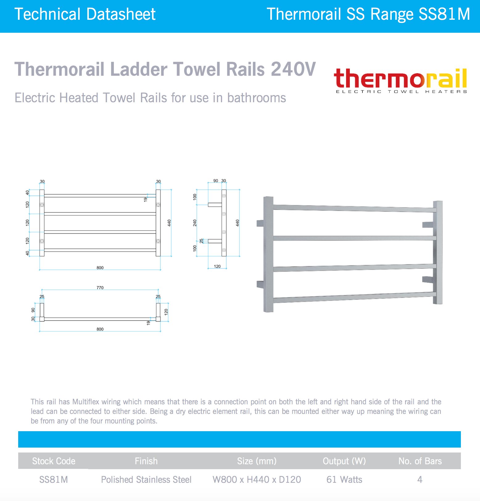 The SS81M Heated Towel Rail provides a premium experience at an accessible cost. Featuring 800x440 dimensions and four polished stainless steel bars, it fits snugly into areas with restricted heights, such as under windows, while still providing ample space for two towels.