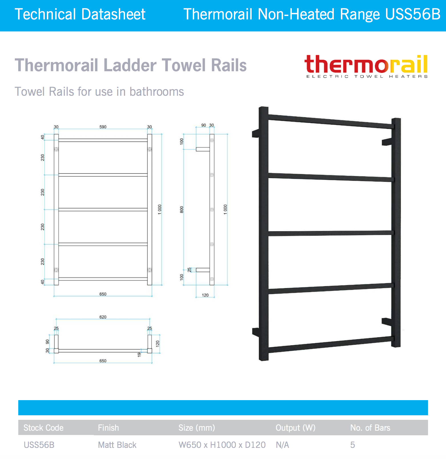 Themorail USS56B is a non-heated square-profiled ladder towel rail with a 650x1000mm form factor and a sleek matte black finish that incorporates 5 horizontal bars.