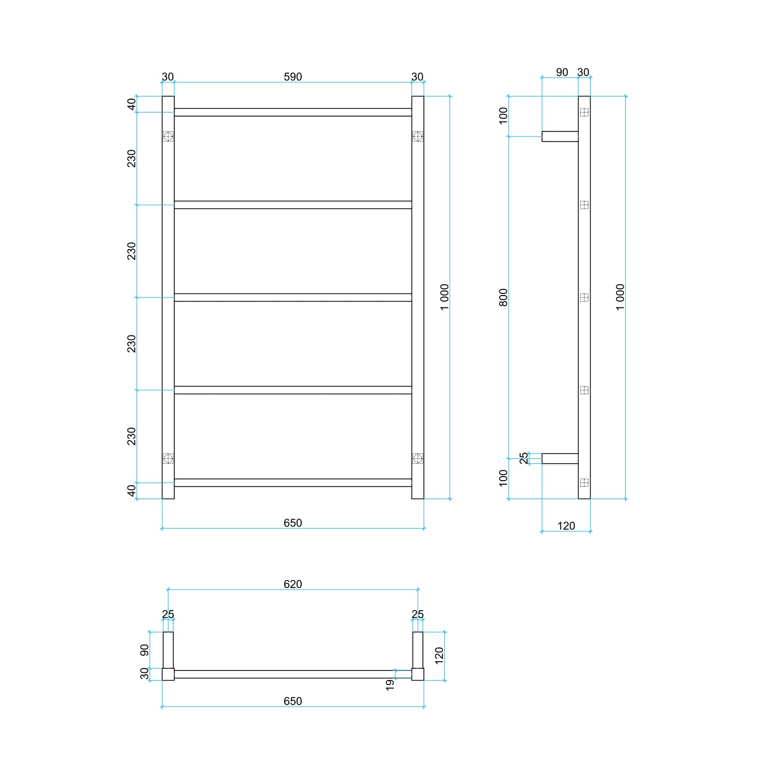 Themorail USS56B is a non-heated square-profiled ladder towel rail with a 650x1000mm form factor and a sleek matte black finish that incorporates 5 horizontal bars.